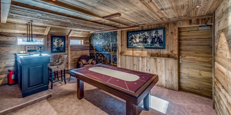 The chalet has 8 bedrooms with king, double, twin and bunk beds, sauna, hot tub, open-plan living area, dining room, kitchen, wood burning stove, entertainment room, heated boot dryers and balconies off each room.